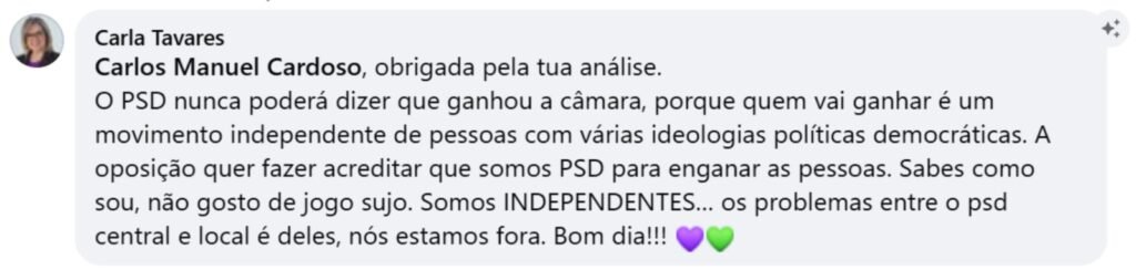 “O PSD nunca poderá dizer que ganhou a câmara, porque quem vai ganhar é um movimento independente de pessoas com várias ideologias políticas democráticas. A oposição quer fazer acreditar que somos PSD para enganar as pessoas. Sabes como sou, não gosto de jogo sujo. Somos INDEPENDENTES… os problemas entre o psd central e local é deles, nós estamos fora. Bom dia!!!”, — Carla Tavares, candidata à União das Freguesias de Setúbal pelo Movimento Setúbal de Volta.